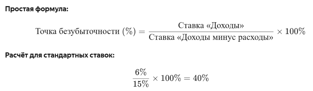 Порог рентабельности устанавливается как доля расходов от выручки, при которой величины налоговых обязательств по схемам «Выручка» и «Выручка за вычетом издержек» совпадают. Если сумма издержек превосходит данный порог, целесообразнее использовать метод «Прибыль за вычетом затрат», а при меньших расходах — «Выручка».